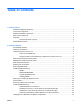 Table of contents 1 Product Features Standard Configuration Features ......................................................................................................... 1 Front Panel Components ..................................................................................................................... 2 Media Card Reader Components ......................................................................................................... 3 Rear Panel Components ................................