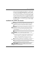 Remplacement de la pile Les piles, les modules batterie et les accumulateurs ne doivent pas être jetés avec les ordures ménagères. Afin qu’ils puissent être recyclés ou traités correctement, contactez les services publics de collecte ou retournez-les à HP/Compaq, à leurs partenaires agréés ou à leurs agents. ATTENTION : l’électricité statique peut endommager les composants électroniques de l’ordinateur ou de l’équipement optionnel.