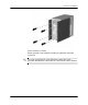 Donanım Yükseltmeleri Ön Sürücü Çerçevelerini Çıkarma 1. Bilgisayarı işletim sisteminden tamamen kapatın ve tüm harici aygıtları kapatın. 2. Güç kablosunu prizden ve bilgisayardan çıkarın ve tüm harici aygıtları sökün. 3. Erişim panelini çıkarın. 4. Ön çerçeveyi çıkarın. 5.25” Sürücü Kapağı Büyük çerçevenin içindeki tutma tırnaklarından birini çerçevenin dışına doğru bastırarak sürücü kapağını çıkarın. Aynı anda sürücü kapağını kendinize doğru çekerek ana çerçeveden çıkarın.