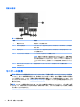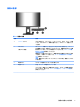 前面の各部 表 1-1 前面の各部 名称 機能 1 メニュー ボタン ボタンを押すと、オンスクリーン ディスプレイ(OSD)メニューを開 いたり、OSD のメニュー項目を選択したり、OSD メニューを閉じたり できます 2 OSD ボタン OSD メニューが開いているときにこれらのボタンを押すと、メニュー 内を移動できます。機能ランプのアイコンは、初期設定のボタンの機 能を示しています。これらの機能について詳しくは、14 ページの機 能ボタンの使用を参照してください (割り当て可能) 機能ボタンを割り当てなおして、頻繁に使用する操作をすばやく選択 できます。手順について詳しくは、14 ページの機能ボタンの再割り 当てを参照してください 注記:機能ボタンはモニターのフロント パネルの端、電源ランプの下 にあります 3 電源ボタン モニターの電源のオン/オフを切り替えます 4 電源ランプ 白色:モニターの電源が入っています オレンジ色:操作しない状態が続いたため、モニターが省電力状態に なっています。詳しくは、15 ページの自動スリープ モードの使用を 参照してください 製品の特長