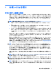 表 3-1 一般的な問題および解決方法 (続き) 問題 原因 解決方法 デスクトップ コン ピューターの電源が入 らない モニターの電源が切れている モニターの電源コードを電源コンセントに差し込 んでいることを確認し、モニターの電源ボタンを押 します モニターがスリープ モードに なっている キーボードの任意のキーを押すかマウスを動かし て、スリープ モードを終了します Windows のディスプレイの向 きが正しく設定されていない Windows デスクトップを右クリックして、[ディス プレイ設定]を選択します。[識別]を選択して、ホス ト コンピューターのディスプレイが物理的に配置 されているとおりに左から右を向いていることを 確認します ボタンのロックアウト 電源ボタンまたはメニュー ボタンを 10 秒程度押し続けると、ボタンの機能がロックアウトされます。 機能を復元するには、ボタンをもう一度 10 秒間押し続けます。この機能は、モニターの電源が入っ ていて、アクティブな信号が表示されており、オンスクリーン ディスプレイ(OSD)メニューが開い ていない場合にのみ使用できます。 H