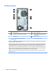 Алдыңғы тақта құрамдас бөлшектері Драйв конфигурациясы үлгіге қарай әр түрлі болады. Кейбір үлгілерде бір немесе бірнеше драйв саңылауын жабатын қақпақша болады. 1 5,25 дюймдік диск ұясы (артқы жапқыш) 6 HP Sleep and Charge (HP ұйқы және зарядтау) мүмкіндігі бар USB 2.0 порты* 2 Жұқа оптикалық диск жетегі (қосымша) 7 USB 2.0 порты 3 Қос күйлі қосу түймесі 8 USB 3.
