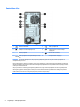 Dijelovi s prednje strane Konfiguracija pogona može se razlikovati ovisno o modelu. Neki modeli imaju masku štitnika koja prekriva odjeljak optičkog pogona. 1 Ležište 5,25-inčnog pogona (iza okvira) 6 Priključak USB 2.0 s HP-ovom funkcijom mirovanja i punjenja* 2 Tanki optički pogon (dodatno) 7 USB 2.0 priključak 3 Gumb za napajanje s dva stanja 8 USB 3.
