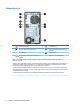 Componenti del pannello anteriore La configurazione dell'unità può variare a seconda del modello. Alcuni modelli sono dotati di un coperchietto del frontalino che protegge l'alloggiamento dell'unità ottica. 1 Alloggiamento unità da 5,25 pollici (dietro il frontalino) 6 Porta USB 2.0 con HP Sleep and Charge* 2 Unità ottica sottile (opzionale) 7 Porta USB 2.0 3 Pulsante di alimentazione a doppio stato 8 Porte USB 3.