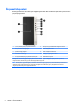 Ön panel bileşenleri Sürücü yapılandırması da modele göre değişiklik gösterebilir. Bazı modellerde optik sürücü yuvasını örten çerçeve kapağı bulunur. 1 5,25 inç sürücü yuvası (çerçevenin arkasında) 6 HP Uyku ve Şarj özellikli USB 2.0 bağlantı noktası* 2 İnce optik sürücü (isteğe bağlı) 7 USB 2.0 bağlantı noktası 3 Çift durumlu güç düğmesi 8 USB 3.