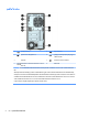 รุน ่ ที่ ไม่ ใช้ vPro 1 แจ็คสัญญาณเส ียงเขา้ 5 พอรต์ USB 3.x (2) 2 ขัว้ ต่อจอภาพแบบ DisplayPort (2) 6 แจ็คสัญญาณออกสำหรับอุปกรณ์เสียงที่ได้รับการ จ่ายไฟจากแหล่งอื่น 3 พอรตเสร ์ ิม 7 แจ็ค RJ-45 (สำหรับระบบเครือข่าย) 4 ่ ดระบบจากสถานะ พอรต์ USB 2.0 พร ้อมรองรับการสังเปิ S4/S5 (4) 8 ขัว้ ต่อสายไฟ หมายเหตุ: USB ่ ่ ดระบบจากสถานะ S4/S5 หากต้องการใช ้แป้ นพ ิมพ ์ HP แนะนำให้เชื่อมต่อแป้นพิมพ์กับพอร์ต USB 2.