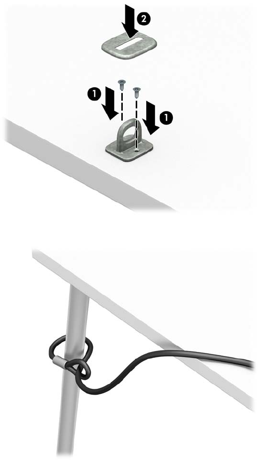 1. Anslut säkerhetskabelns fästanordning på ett skrivbord med lämpliga skruvar (skruvarna medföljer ej)