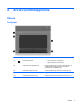 Komponent Kirjeldus (9) Kõvaketta märgutuli ● Vilkuv valge: kõvaketas on kasutusel. (10) Toite märgutuli ● Valge: arvuti on sisse lülitatud. ● Vilkuv valge: arvuti on säästurežiimis. ● Väljas: arvuti on välja lülitatud või talveunerežiimis. Ekraan Komponent Kirjeldus (1) WLAN-i antennid (2)* Saadavad ja võtavad vastu raadiosignaale traadita kohtvõrkudega (WLAN) suhtlemiseks. (2) Veebikaamera märgutuli Sees: veebikaamera on kasutusel.