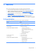 Resource Contents Help and Support ● Operating system information To access Help and Support, select Start > Help and Support. ● Software, driver, and BIOS updates ● Troubleshooting tools NOTE: For country- or region-specific support, go to http://www.hp.com/support, select your country or region, and follow the on-screen instructions.