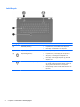 Jelzőfények Részegység (1) Érintőtábla jelzőfénye ● Folyamatos fény: az érintőtábla ki van kapcsolva. ● Nem világít: az érintőtábla be van kapcsolva. (2) Caps lock jelzőfény Folyamatos fény: a Caps lock be van kapcsolva. (3) Tápfeszültségjelző fény ● Folyamatos fény: a számítógép be van kapcsolva. ● Villogó fény: a számítógép alvó állapotban van. ● Nem világít: a számítógép kikapcsolt vagy hibernált állapotban van.