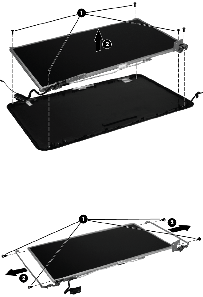 17. Remove the display hinges (2) from the display panel. The display hinges are available using
