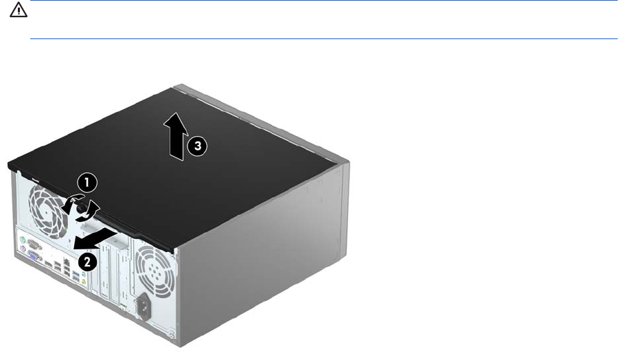 5. 鬆開電腦背面的指旋螺絲 (1),然後將面板向後滑動 (2),再向上抬起離開電腦 (3)。