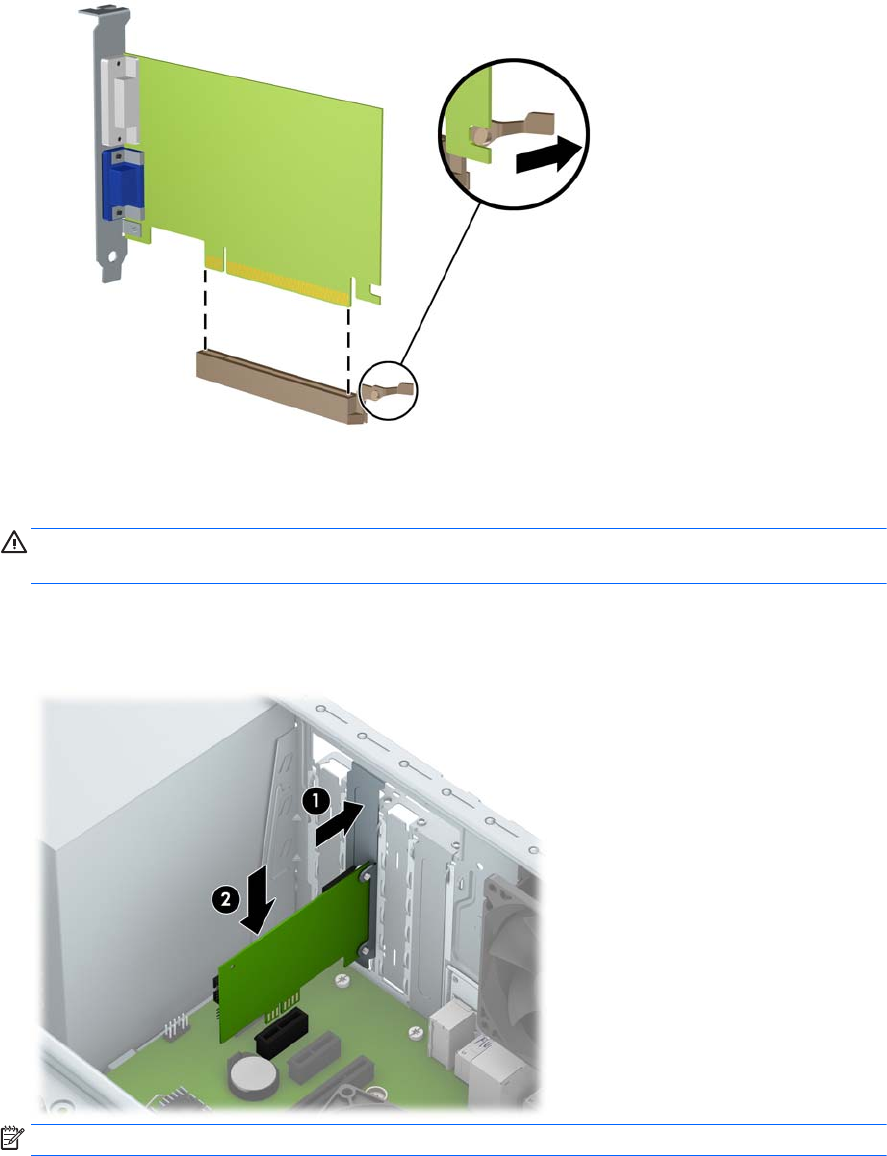 (1),讓擴充卡上的托架底部可推入機箱上的小插槽。將擴充卡垂直下壓到系統主機板的擴充槽 (2)