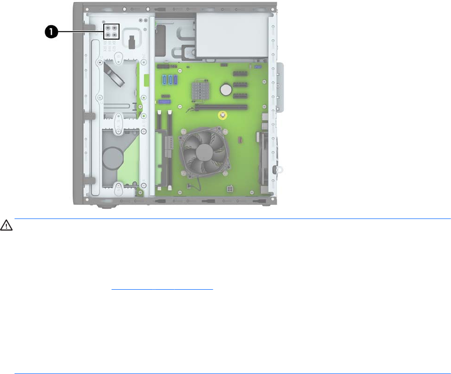 HP 提供四顆額外的 6-32 硬碟機固定螺絲,安裝在機殼背面的機座正面 (1)。在硬碟機插槽中安裝