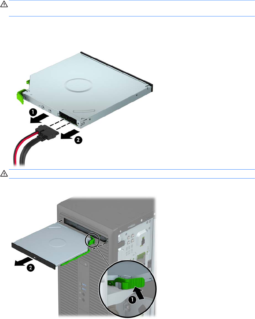 6. 拔除光碟機後方電源線 (1) 和資料排線 (2)。
