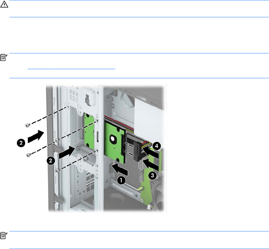 6. 將硬碟滑入硬碟機機槽 (1),然後安裝四顆 6-32 固定螺絲 (2),將硬碟機固定在定位。將資料排線 (3)