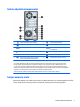 Priekinio skydelio komponentai Atsižvelgiant į modelį, diskų įrenginių konfigūracija gali skirtis. Kai kuriuose modeliuose yra dangtelis, dengiantis optinio diskasukio skyrių. 1 Plonasis optinis diskų įrenginys (pasirinktinis) 5 Standžiojo disko veikimo indikatorius 2 Dviejų būsenų įjungimo mygtukas 6 USB 3.