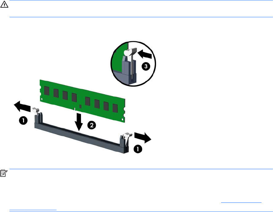 6. Roztiahnite obe zarážky zásuvky pamäťového modulu (1) a vložte pamäťový modul do zásuvky (2).
