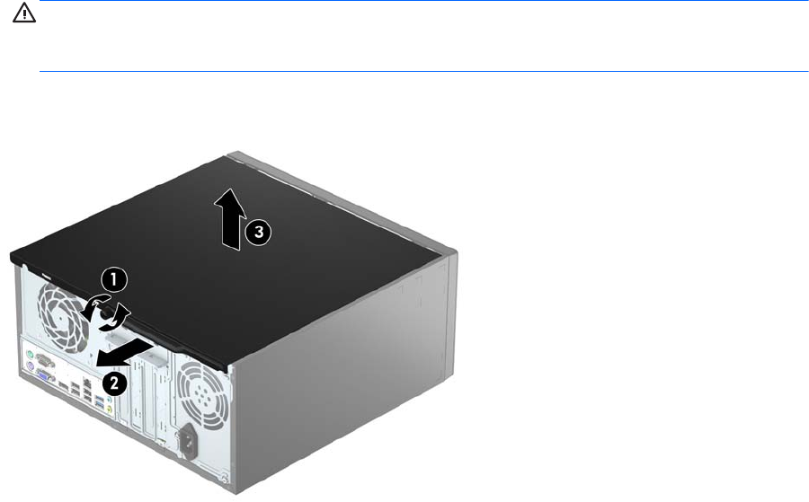 5. Послабте гвинт-баранчик на задній панелі комп'ютера (1), потім посуньте панель назад (2) та зніміть