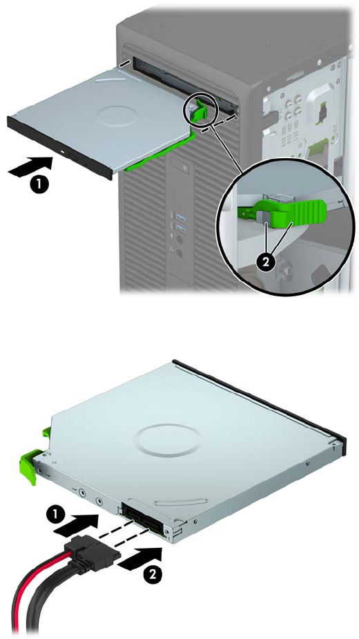 10. Priključite kabel za napajanje (1) i podatkovni kabel (2) na stražnju stranu optičkog pogona.
