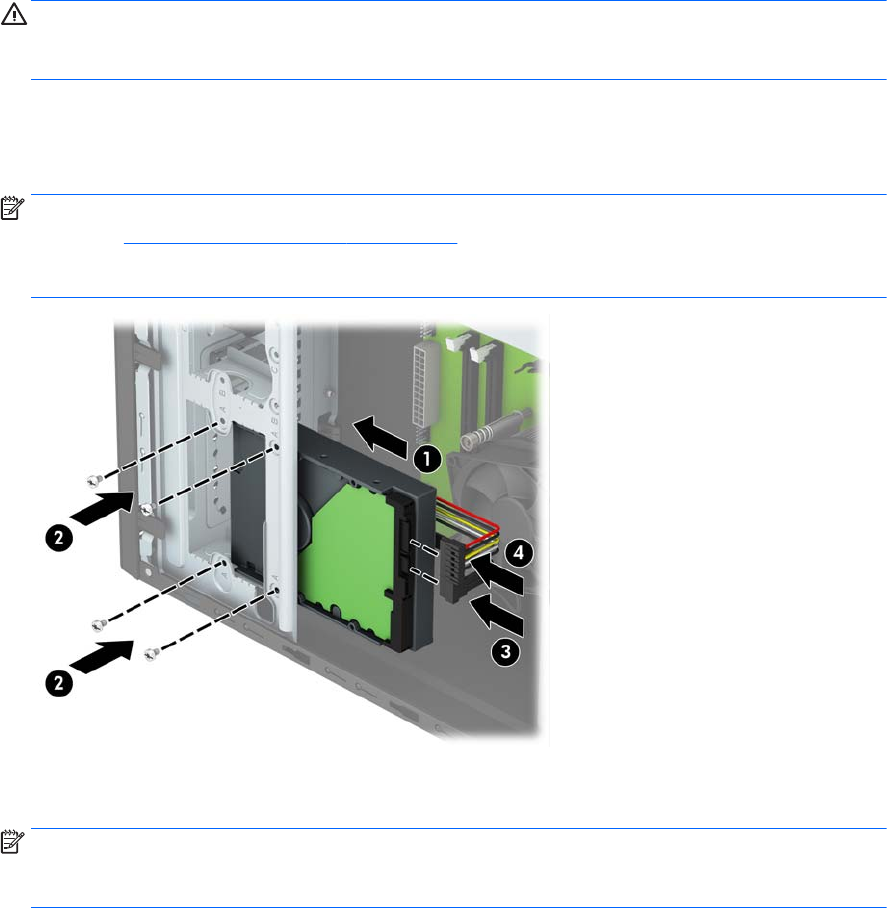 6. Gurnite disk u ležište pogona (1) i pričvrstite četiri učvrsna vijka 6-32 (2) da učvrstite pogon. Spojite