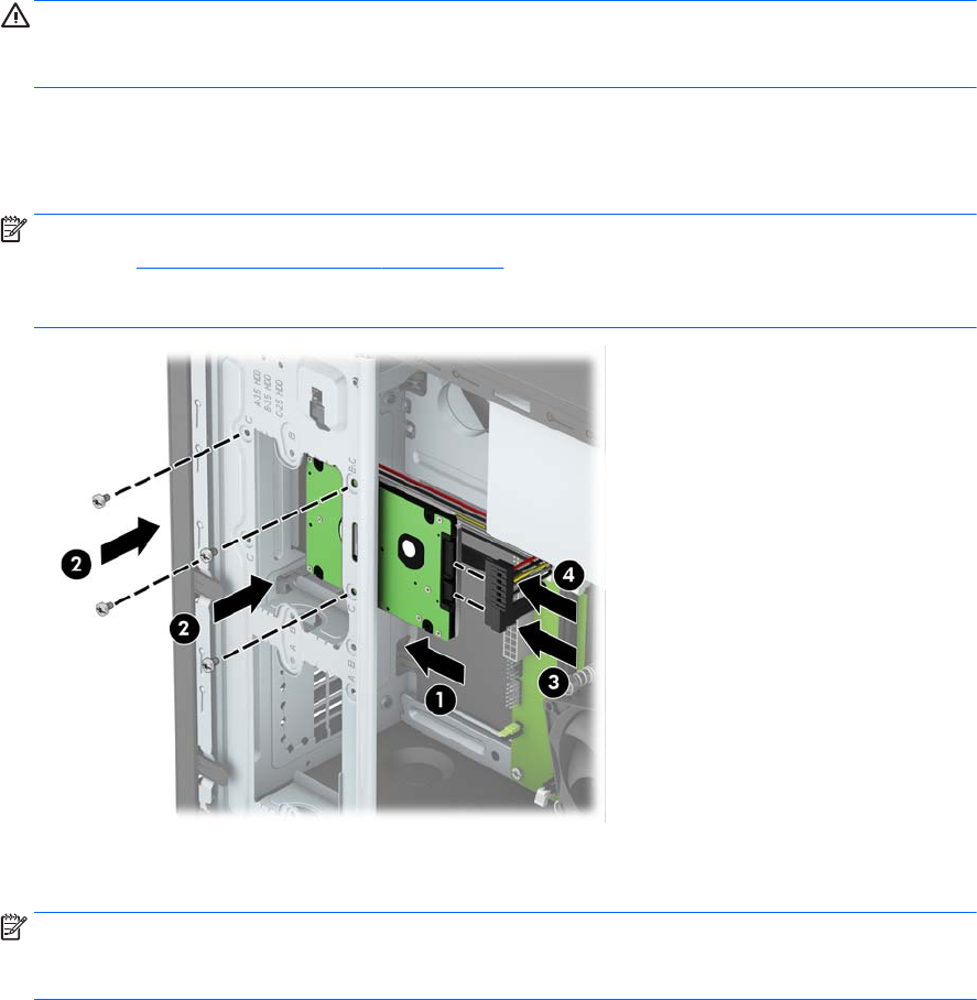 6. Gurnite disk u ležište pogona (1) i pričvrstite četiri učvrsna vijka 6-32 (2) da učvrstite pogon. Spojite