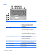 Onderdelen aan de voorkant Component Beschrijving (1) ● Aan: de computer is ingeschakeld. ● Knipperend: de computer staat in de slaapstand. ● Uit: de computer is uitgeschakeld of staat in de hibernationstand. ● Aan: een accu wordt opgeladen. ● Knipperend: een accu die de enige beschikbare voedingsbron is, is bijna leeg. Wanneer de accu een kritiek laag ladingsniveau bereikt, begint het acculampje snel te knipperen.