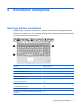 2 Klaviatūros naudojimas Sparčiųjų klavišų naudojimas Spartieji klavišai – tai klavišo fn (1) ir klavišo esc (2) arba vieno iš funkcinių klavišų (3) kombinacijos. Piktogramos ant klavišų nuo f1 iki f12 vaizduoja sparčiųjų klavišų funkcijas. Sparčiųjų klavišų funkcijos ir procedūros aptariamos kituose skyriuose. Funkcija Spartusis klavišas Parodykite sistemos informaciją. fn+esc Atidarykite Žinyną ir palaikymą. fn+f1 Atidarykite spausdinimo parinkčių langą. fn+f2 Atidarykite žiniatinklio naršyklę.