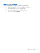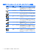 無線アイコンとネットワーク ステータス アイコンの確認 アイコン 2 名前 説明 無線(接続済み) コンピューターのハードウェアとしての無線ランプおよび無線ボ タンの位置を示します。ソフトウェアとしては、コンピューター 上の[HP Wireless Assistant]ソフトウェアを示し、また、1 つ以上 の無線デバイスがオンになっていることを表します 無線(切断済み) コンピューター上の[HP Wireless Assistant]ソフトウェアおよびす べての無線デバイスがオフになっていることを示します HP Connection Manager [HP Connection Manager]を開きます。[HP Connection Manager] では、HP モバイル ブロードバンド デバイスを使用した接続を作 成できます(一部のモデルのみ) 有線ネットワーク(接続済 み) 1 つ以上のネットワーク ドライバーがインストールされていて、1 つ以上のネットワーク デバイスがネットワークに接続されている ことを示します ネットワーク(接続済み) 1 つ以上のネットワーク ドライバー