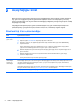 Белгі Мүмкін болатын шешім Бағдарламалық құралды немесе аппараттық құрал драйверін қайта орнату Өндіруші орнатқан бағдарламалық құрал немесе аппараттық құрал драйверлерінің кез келгені зақымдалған болса, оны HP қалпына келтіру менеджері қолданасын пайдалану арқылы қайта орнатуға болады (таңдаулы үлгілер үшін). ЕСКЕРІМ: Компьютерде қамтылған CD немесе DVD дискілерімен келген бағдарламалық құралдарды қайта орнату үшін HP қалпына келтіру менеджері пайдаланбаңыз.