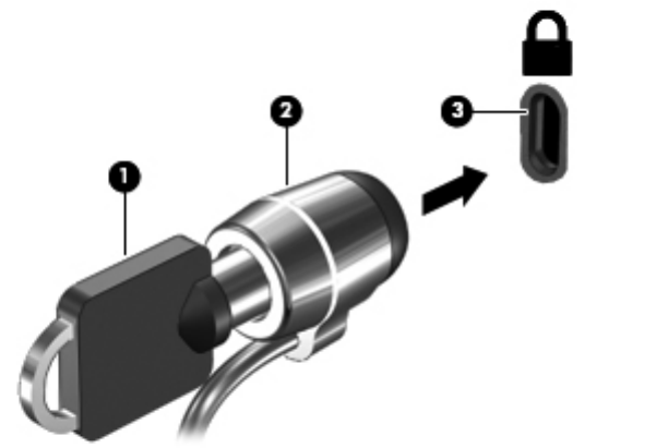 3. Ievietojiet drošības kabeļa slēdzeni datora drošības kabeļa slotā (3) un pēc tam aizslēdziet