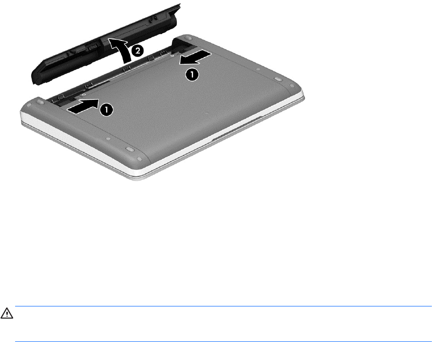 2. Kantel de accu omhoog (2) en verwijder deze uit de computer.