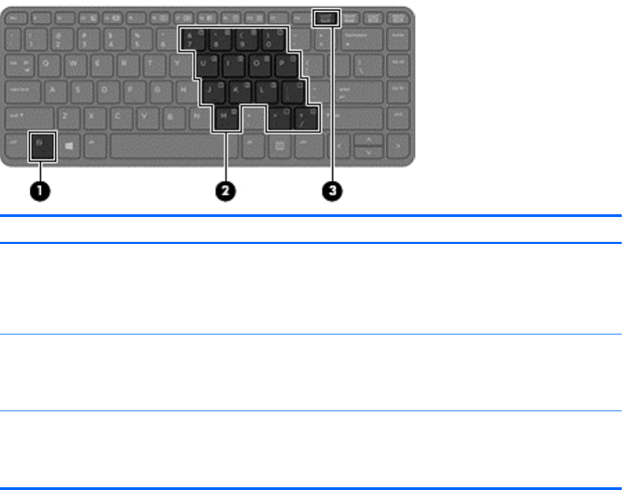 (3) num lk-tast Slår den innebygde numeriske tastgruppen på og av når du