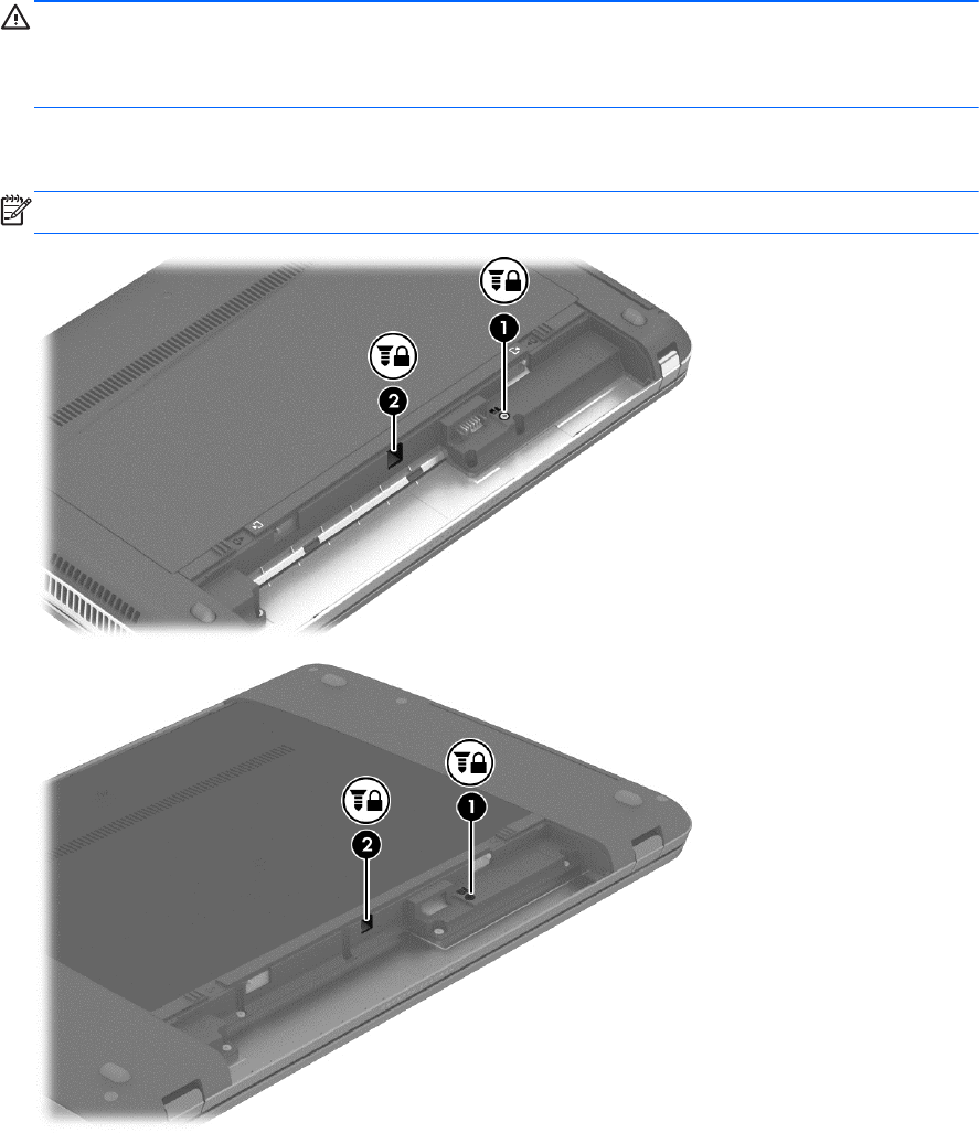 2. Nehmen Sie die Sicherungsschraube aus dem Akkufach heraus (1), und setzen Sie sie in die