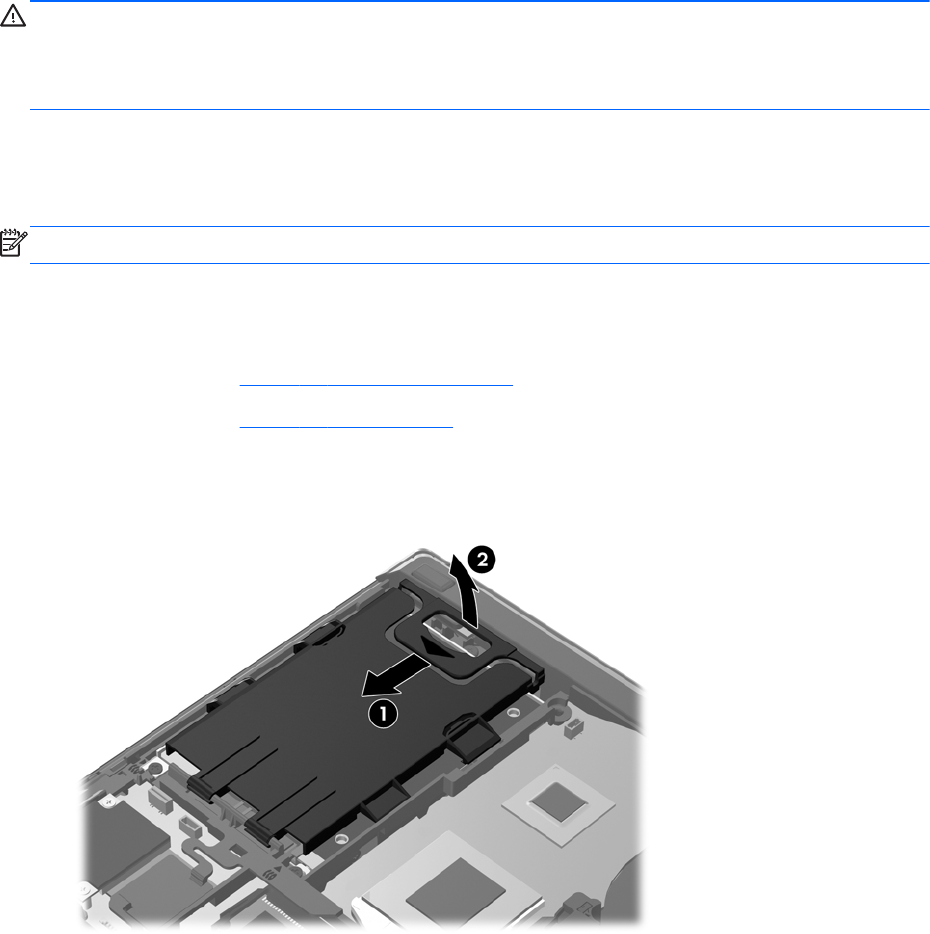 8. 將硬碟上的塑膠定位片 (2) 拉向電腦側邊,以從連接器釋放硬碟。