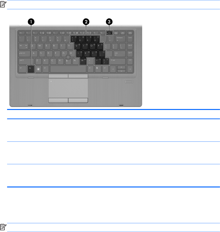 참고: 컴퓨터에 외장 키보드나 숫자 키패드가 연결되어 있으면 내장 숫자 키패드는 꺼져 있습니다.