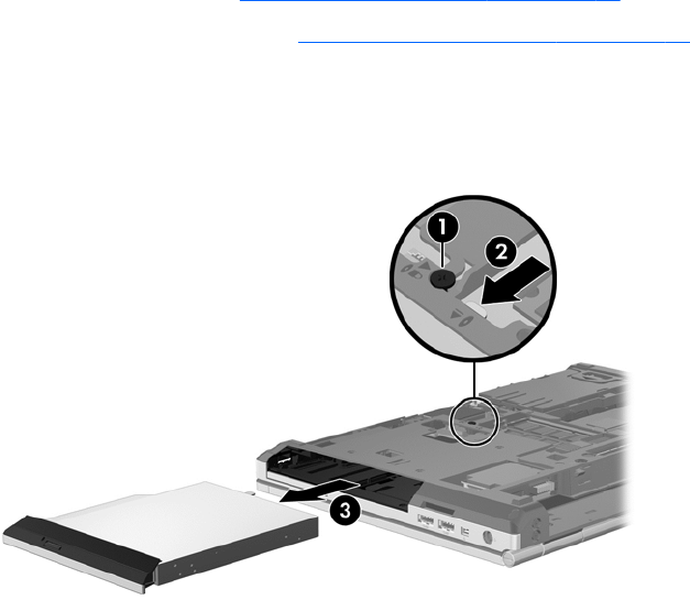 9. Pomocí plochého šroubováku jemně zatlačte na uvolňovací západku optické jednotky (2).
