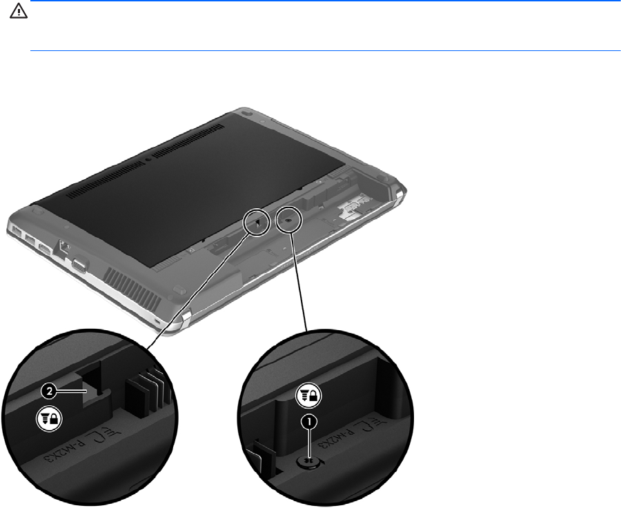 2. Ta ut säkerhetsskruven ur batterifacket (1) och sätt in den (2) så att luckan fästs på plats.