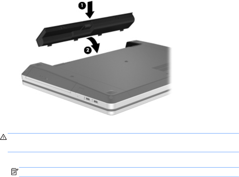 Indsæt batteriet (1) i batterirummet, indtil det sidder fast (2).