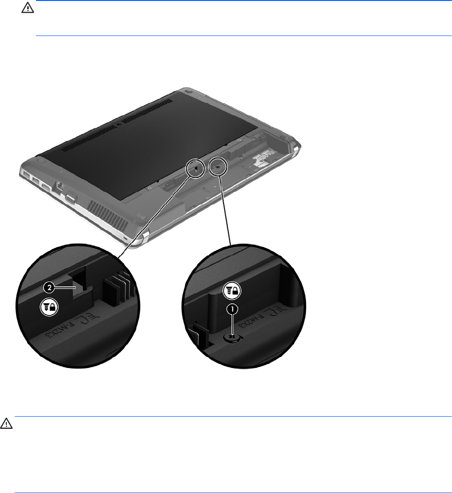 2. Fjern sikkerhedsskruen fra batterirummets inderside (1), og sæt den ind i servicedækslet (2) for