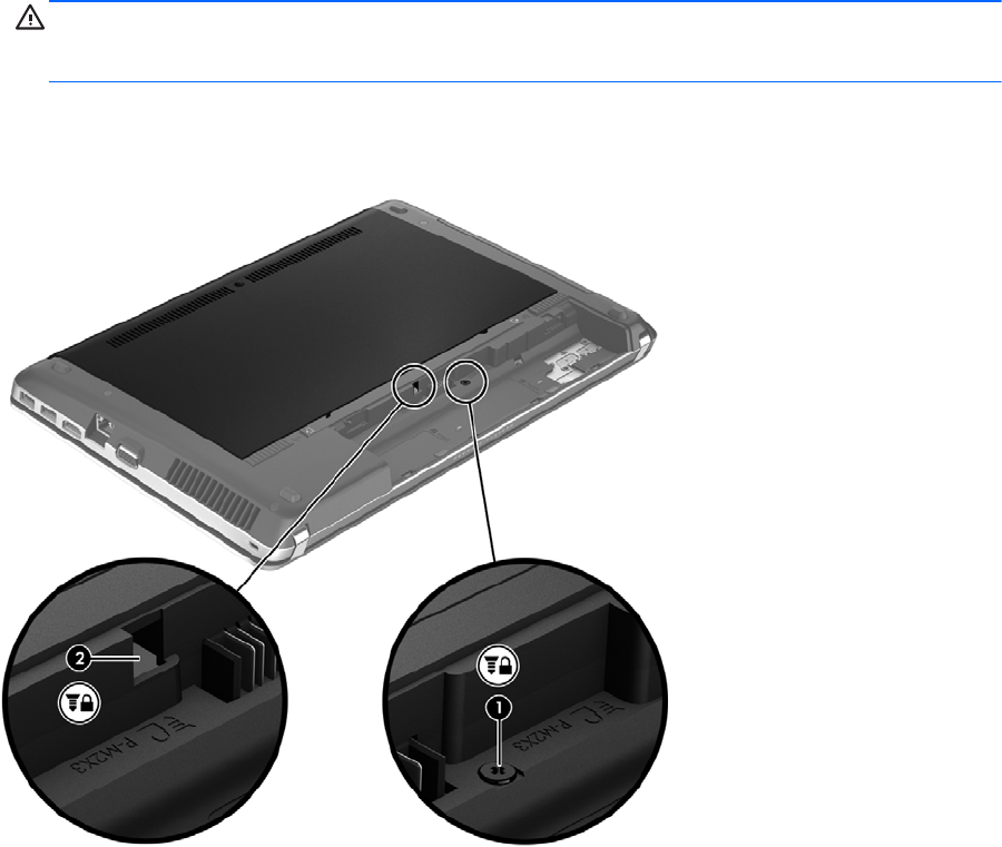 2. Retire o parafuso de segurança do interior do compartimento da bateria (1) e introduza-o (2)