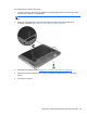 6. Tirare la linguetta di plastica sull'unità disco rigido (2) verso la parte laterale del computer per