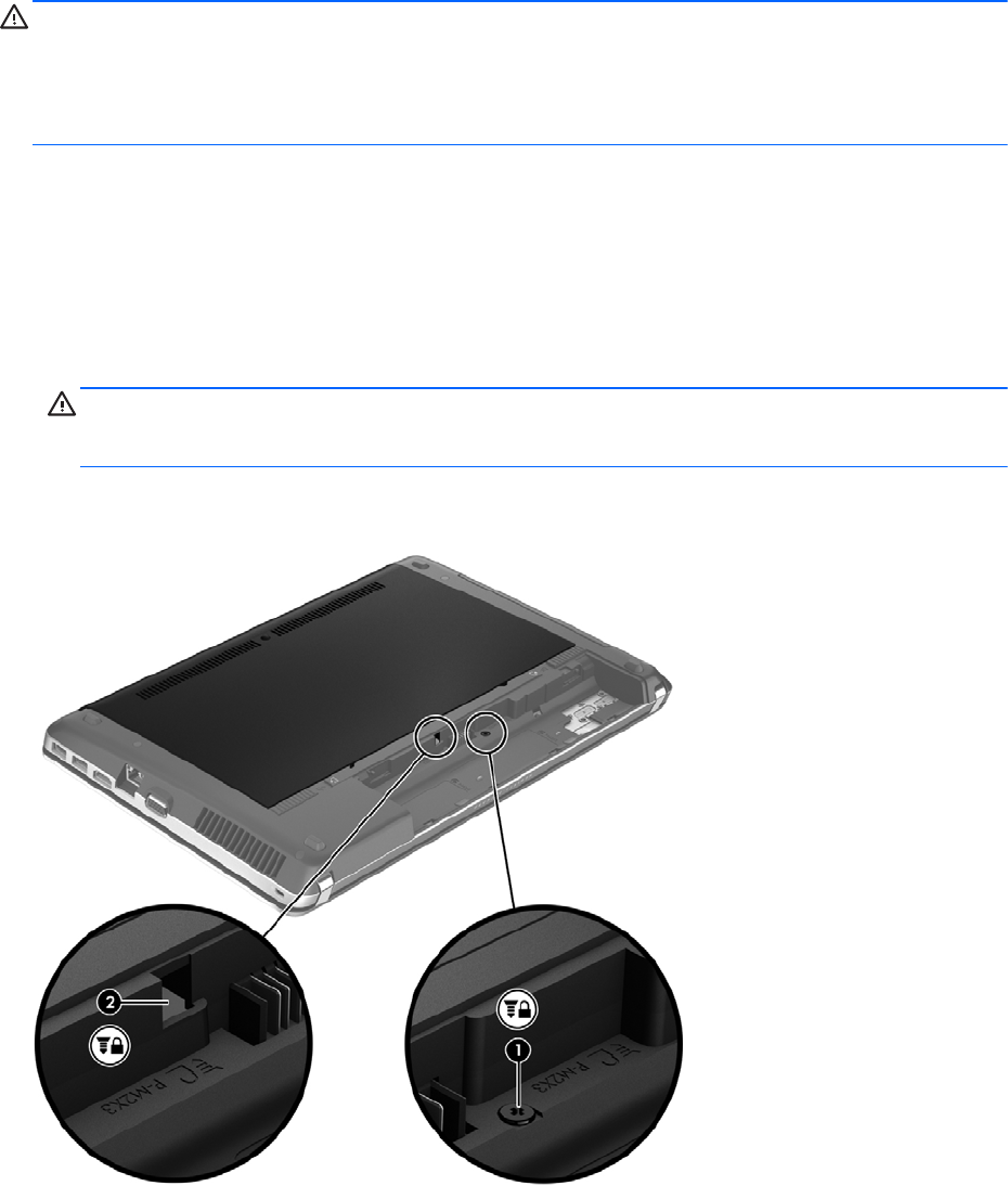 2. Võtke turvakruvi akusahtlist (1) välja ja sisestage see (2), et lukustada hoolduskate oma kohale.