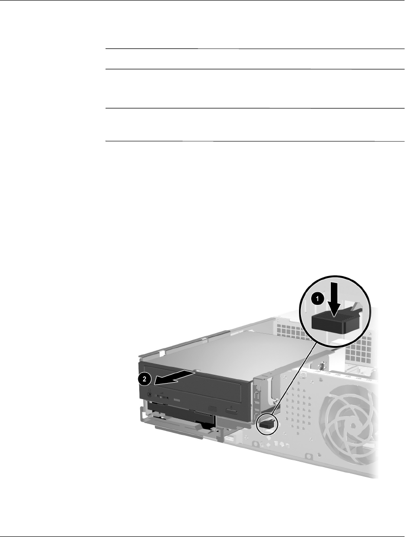 4. 向下按位于机箱正面光驱旁边的绿色锁定器 1,并向前滑动