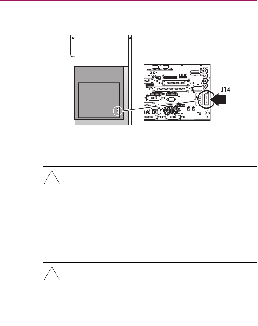 9. Plug the fan assembly power cable into connector J14 on the robotics