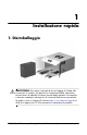 1 Installazione rapida 1: Disimballaggio Å AVVERTENZA: Per ridurre il pericolo di lesioni leggere la Guida alla sicurezza e al comfort, che descrive la sistemazione della workstation, la posizione e le abitudini di lavoro corrette degli operatori di computer, e contiene importanti informazioni di sicurezza elettriche e meccaniche. La guida si trova su Internet all’indirizzo http://www.hp.com/ergo e sul disco fisso oppure nel CD Documentation in dotazione al prodotto.
