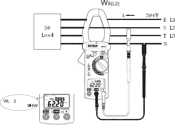 b. Connect the test probe of the V (red) terminal to the third phase (e.g. T or L3