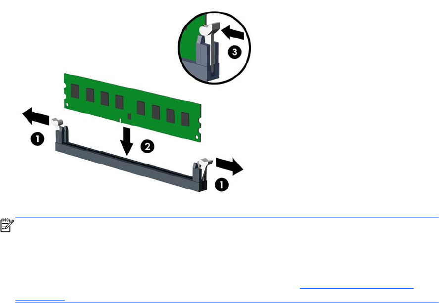 8. Open both latches of the memory module socket (1), and insert the memory module into the