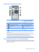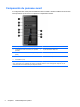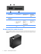 Composants du panneau avant La configuration des unités peut être différente selon le modèle. Certains modèles sont munis d’un cache protecteur qui recouvre un ou plusieurs compartiments d’unité. 1 Unité optique de 5,25 pouces (en option) 6 Connecteur du micro 2 Compartiment d'unité mi-hauteur 5,25" (derrière panneau) 7 Voyant d'activité du disque dur 3 Lecteur de cartes multimédias de 3,5 pouces (en option) 8 Ports USB 3.