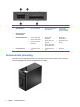 Komponenter på frontpanelen Enhetskonfiguration kan variera beroende på modell. Vissa modeller har ett panelskydd som täcker ett eller flera enhetsfack. 1 5,25-tums optisk enhet (tillval) 6 Mikrofonuttag 2 5,25-tums enhetsfack, halva höjden (bakom täckram) 7 Aktivitetslampa för hårddisk 3 3,5-tum, mediekortläsare (tillval) 8 USB 3.0-portar (blå) 4 Strömbrytare med två lägen 9 Hörlurskontakt 5 USB 2.0-portar (svarta) OBS! Strömlampan lyser vanligtvis vit när strömmen är på.